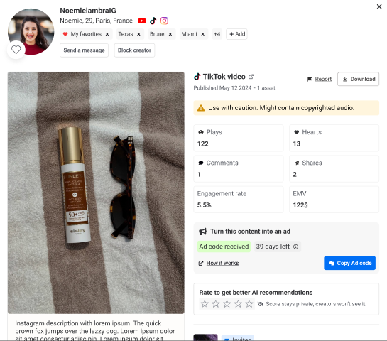 Use this Ad Code in your TikTok or Meta Ads Manager and launch an advertising campaign using the influencer’s content.