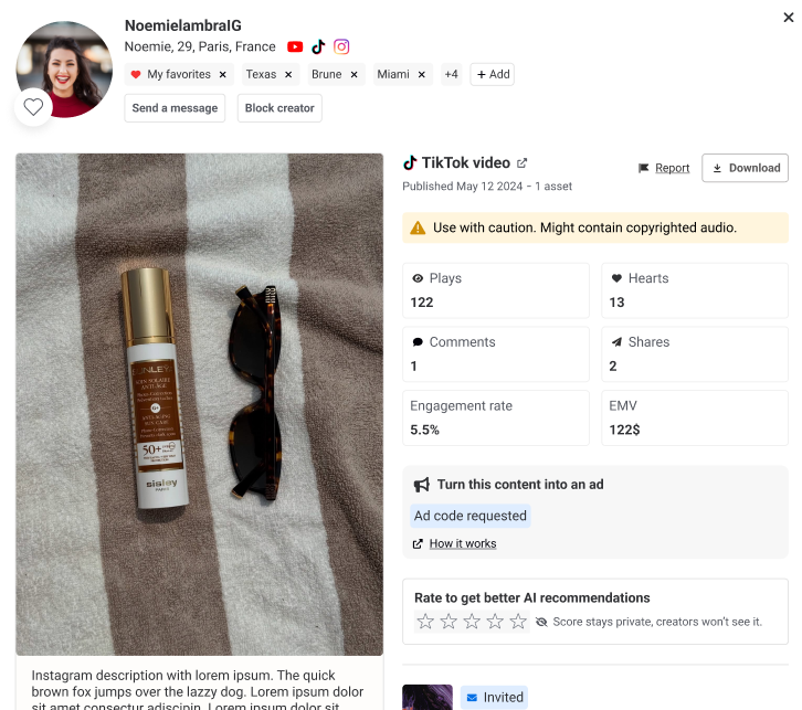 By supporting both TikTok Spark Ads and Instagram Partnership Ads, Skeepers offers a complete system to boost creator content through paid media (you will need to allocate an ad budget for this). This allows you to: