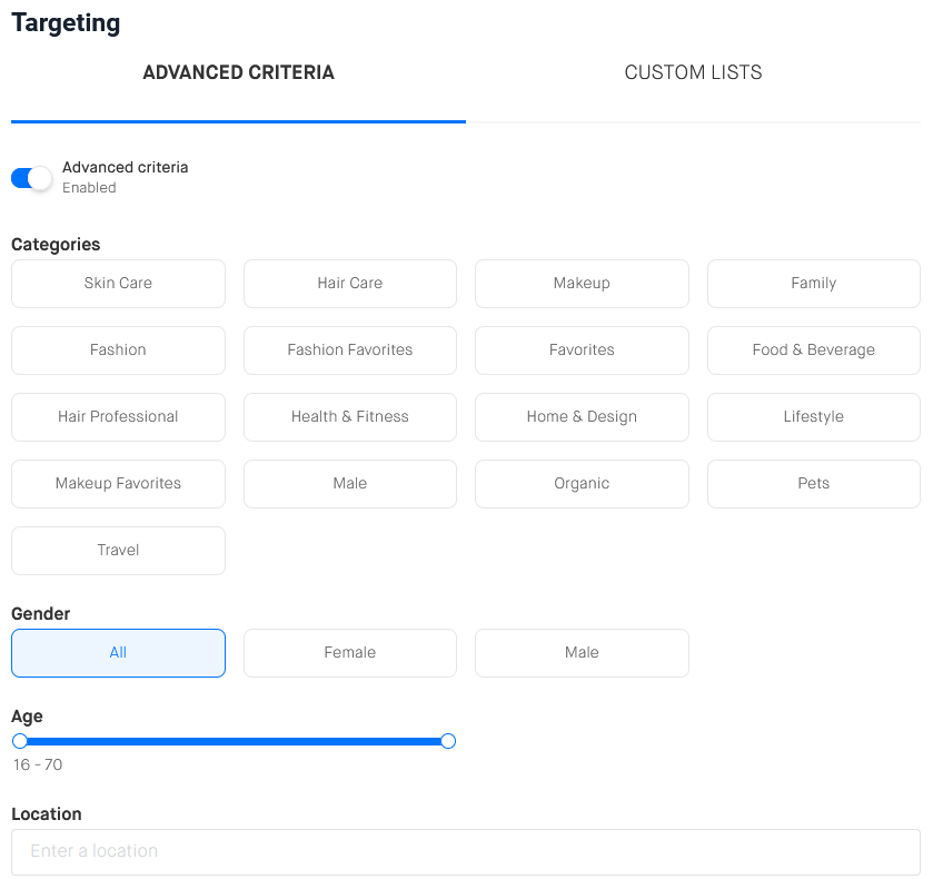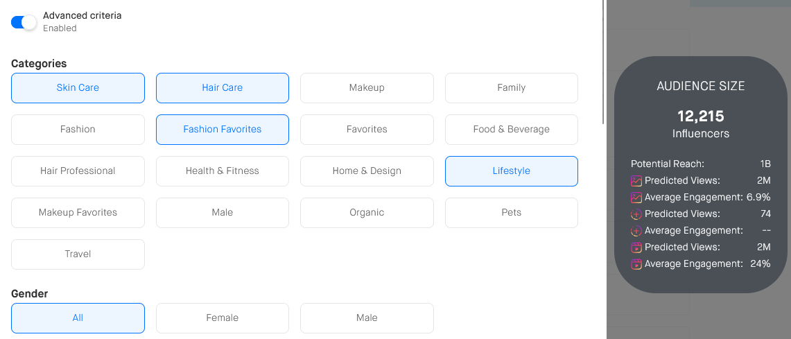When creating a campaign, you can target an audience based on different creator filters: interests, age, physical traits, interactions (expected views and likes), etc.