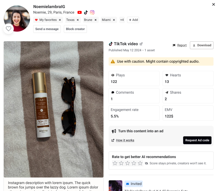 Al hacer clic en el contenido de un influencer que ya compartió su Ad Code, verás: