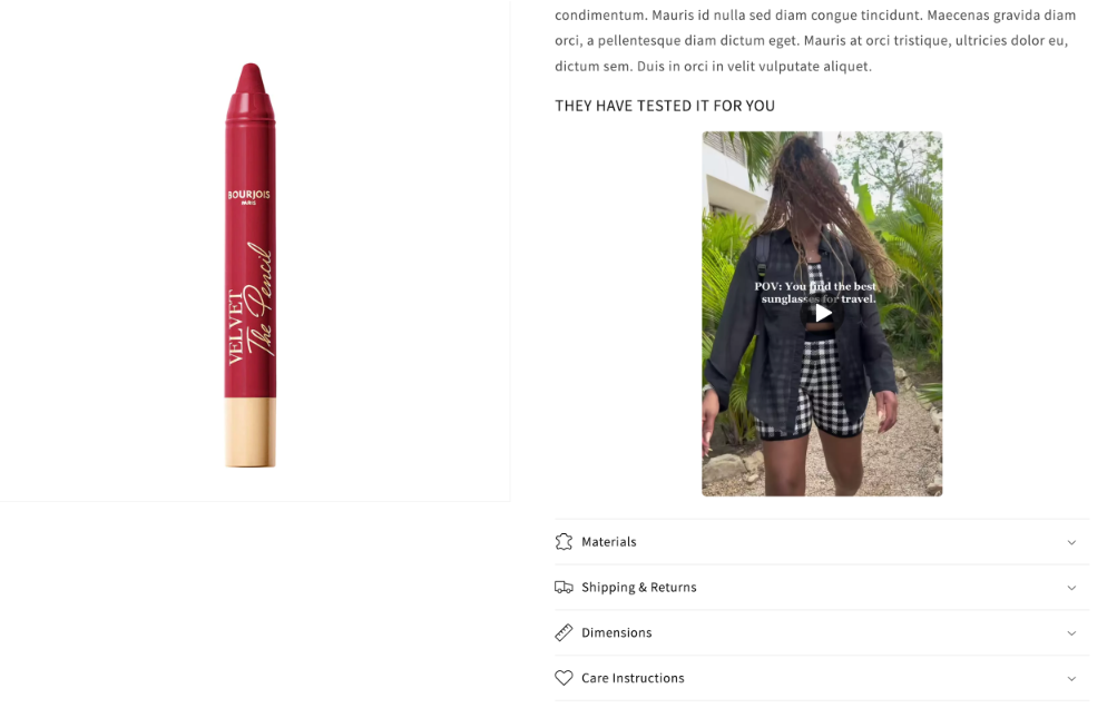 Añada este artículo a su sitio web.1em;"Añada este script en cualquier lugar de la página del producto para mostrar un contenido shoppable, el enlace con el producto se hará automáticamente con la URL del producto que nos envíe en su feed de productos.